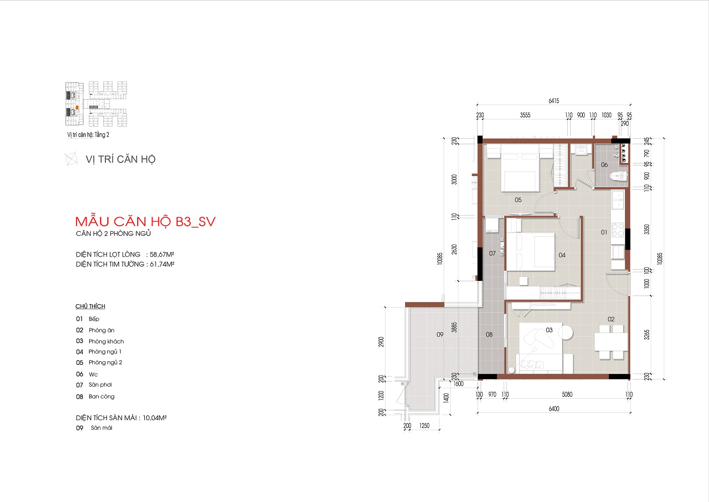 • Căn hộ 02PN: 51,55 – 68,21 m2